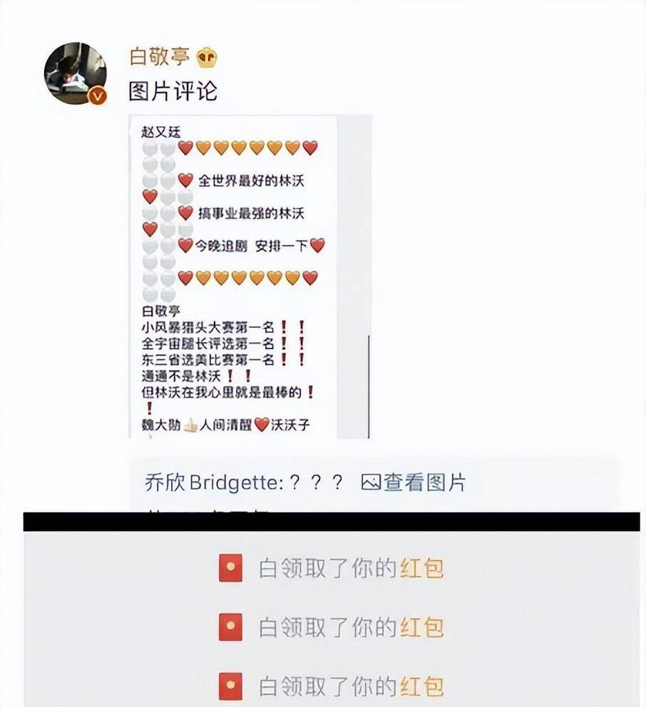 随后,白敬亭此前与乔欣的风波也被翻出。据报道,乔欣为了宣传新剧,在一个群里给魏大勋、白敬亭和赵又廷发了红包,并制定了文案让三人各自发布。然而,白敬亭却领取了3个红包后直接复制了其他两人的文案,并晒出了乔欣的黑图和群内聊天记录,被指拿钱不干事,把乔欣气得够呛。白敬亭粉丝又称只是朋友之间的互动。