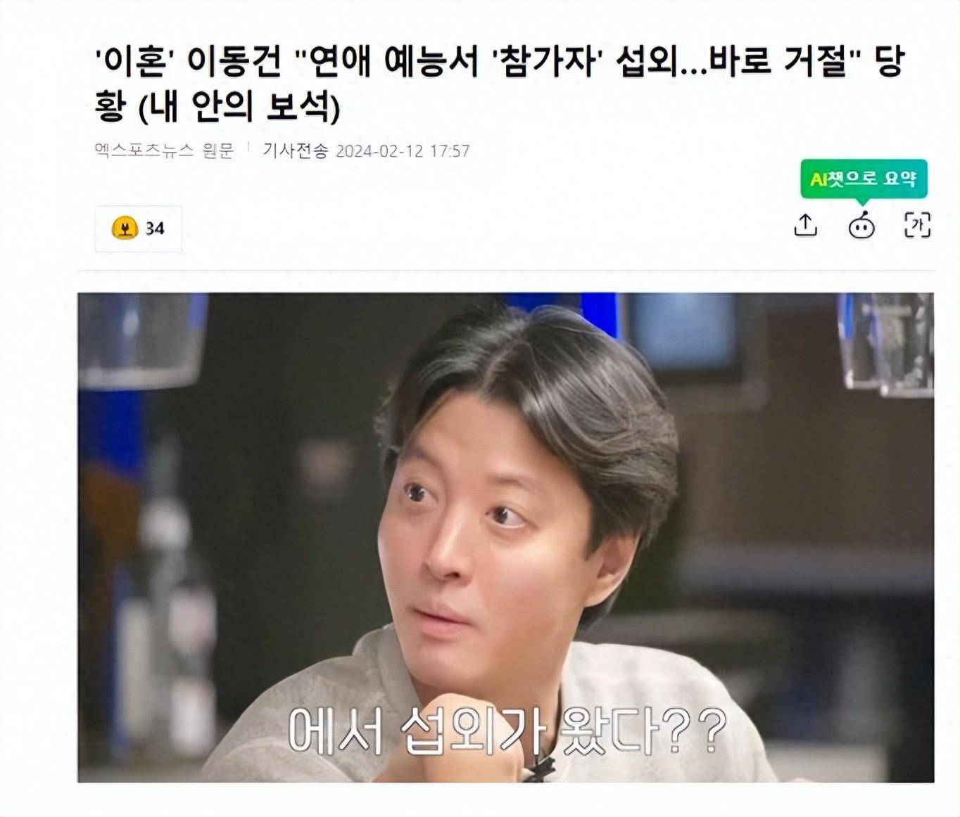 韩国知名男星,演员李东健,透露了在被邀请参加相亲节目时感到尴尬的轶事。2月12日,有韩国媒体报道,在金基石的YouTube频道上传了视频,金基石的朋友李东健作为嘉宾出现。