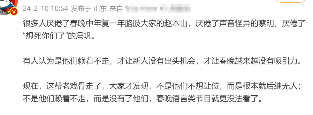 有网友分析,曾有人厌倦了春晚的“钉子户”赵本山,蔡明,冯巩,觉得这些“老人”赖着不走,让新人没有出头之日,但当这帮“老人”离开了舞台,大家才发现,根本就是后继无人,没有了这些“老人”,春晚语言类节目就更无法看了。