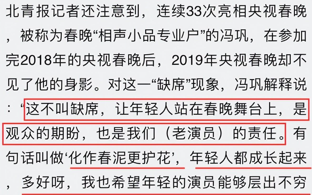 65岁的冯巩曾连续32年登上春晚舞台,在第33年的时候,冯巩终于决定退下了,他用“化作春泥更护花”来形容自己的“退出”,觉得让年轻人登上舞台是观众的期盼,也是老演员的责任。