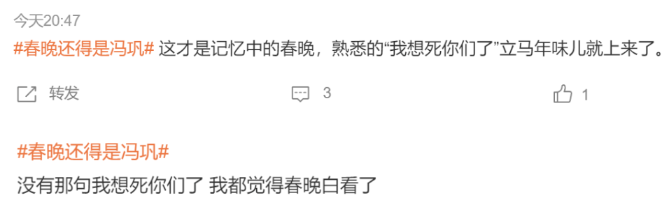 正如如今的春晚现状,那么多的新人,那么多的流量明星,仍然抵不过冯巩的一句:我想死你们了。