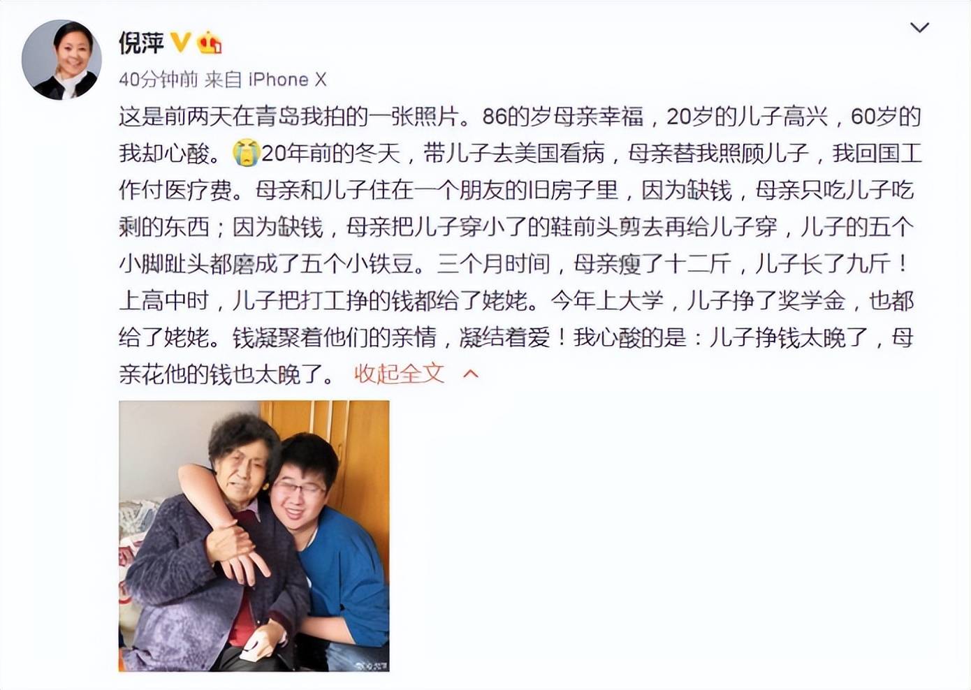 这个病要定期去医院治疗,为了全心全意照顾孩子,倪萍不得不放弃事业从央视工作辞职,用10 年的时间带着儿子奔波于各大医院,