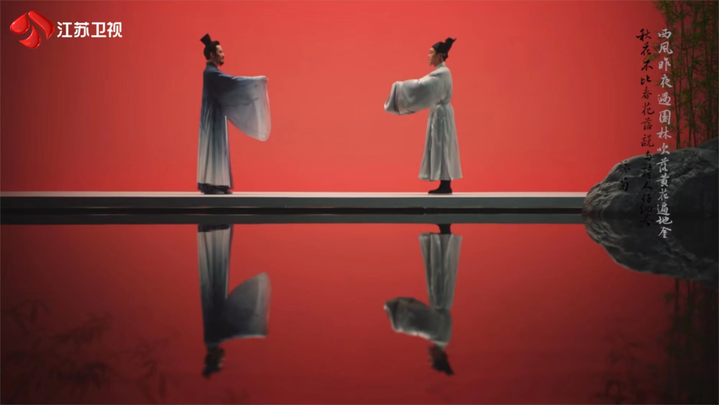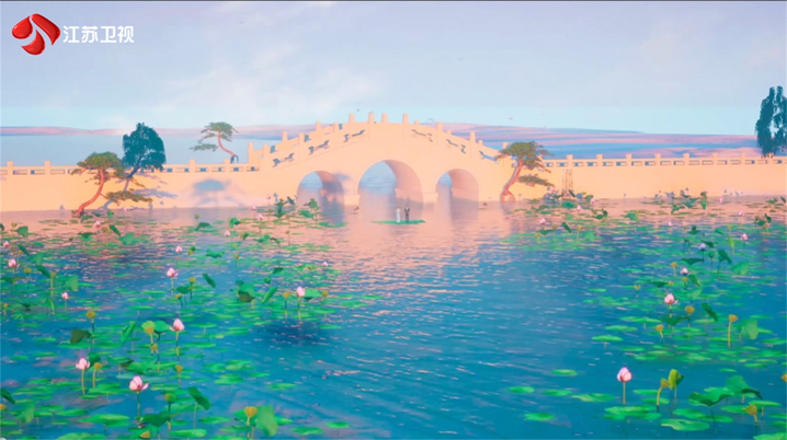 还有在汤非、王弦演唱《运河遥想》时的舞台呈现,则是运用最前沿的XR技术,通过行进式的展现,让观众听着歌曲演绎,身临其境地感受到大运河的四季美景与南北风情,也聆听着运河之水流淌千年的故事。数字技术的赋能,让歌曲表达承载了更多的信息含量,也最大程度呈现江苏水乡水韵的地域特点。