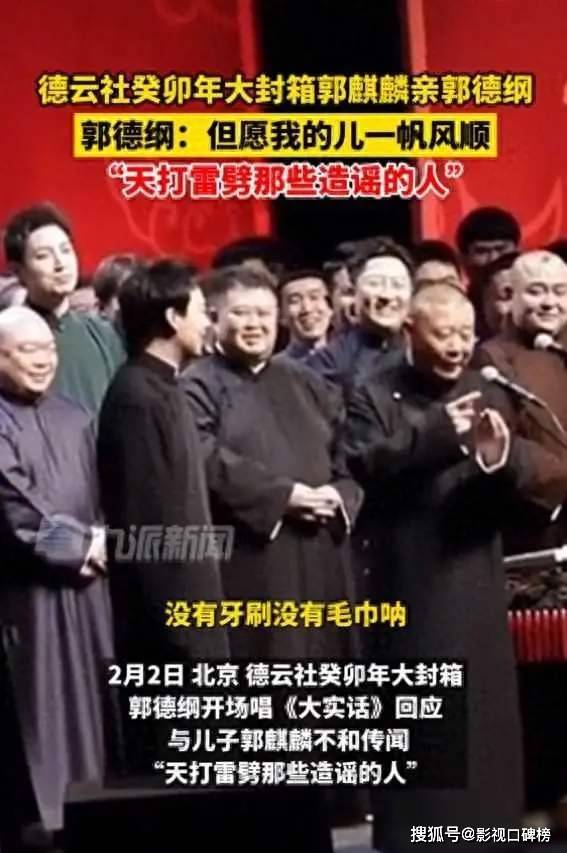 郭德纲在现场开唱《大实话》,赢得众弟子们的一片叫好。他也改动了一些内容是“没有牙刷也没有毛巾,天打雷劈那些造谣的人”。原因是,前不久在网络上传闻郭德纲与大儿子郭麒麟不和,殊不知,这么一传郭德纲耿耿于怀。