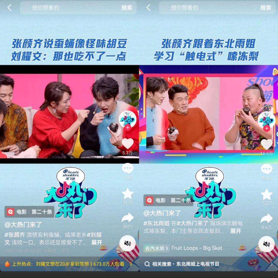 在新片预告中,我们看到有1881.7万粉丝的东北雨姐带着东北特产冻梨和蚕蛹加盟节目,现场表演“触电式”嗦冻梨,引流一众雨姐的粉丝进入评论区,高呼“雨姐成了我娱乐圈人脉”。同时,这条视频也获得了16.4万点赞。而#刘耀文一口蚕蛹一口冻梨 的卡段则登上抖音热榜,获得152.9万人的观看。