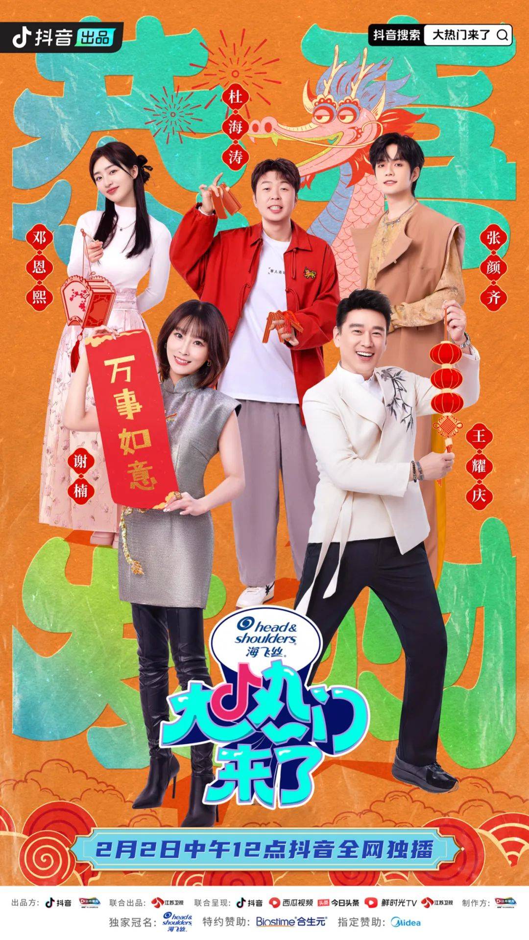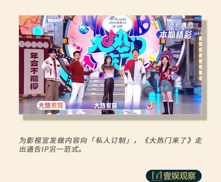 2月2日,抖音全新宣发通告节目《大热门来了》开播,邀请邓恩熙、杜海涛、王耀庆、谢楠、张颜齐组成“大热家族”主持团,每期一个当下热门的影视作品主创团队空降,通过游戏、表演、访谈等环节,揭秘创作幕后故事,满足用户的好奇心。