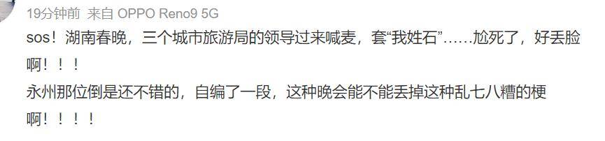 湖南卫视邀请了三个地方的文旅,利用网络大热喊麦公式“我姓石”来了一波“我姓湖”的文旅式喊麦,但并没有受到观众的喜爱。反而让人觉得,频繁玩梗,强行融入,真的好尴尬。