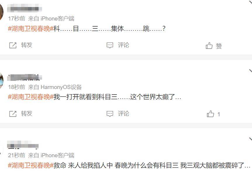 如果说前面的“我姓湖”和“搭子”只是让网友感觉到尴尬和无聊,那么随后全场大跳“科目三”让观众彻底对湖南卫视的小年夜春晚失去兴趣。早在之前,就有网友希望“科目三”作为网络俗梗,不要出现在任何一个春晚上。