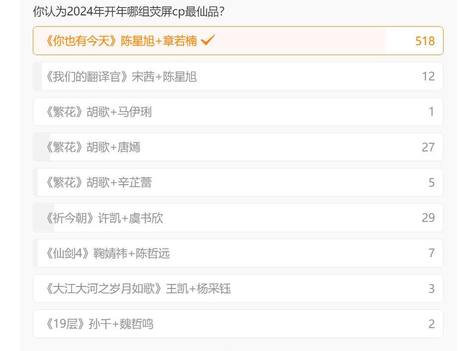 看看投票名单,不乏有着爆款《繁花》中的CP,也有热门IP“仙剑”剧中的CP,可是最终小甜剧《你也有今天》中的CP却脱颖而出。