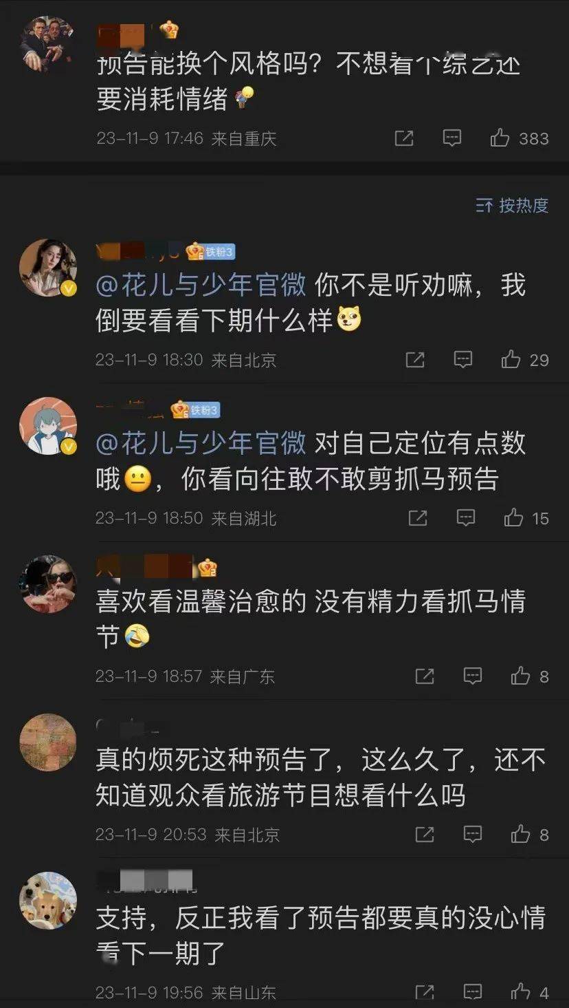 另外,花少之所以能够回归观众最爱的状态,更是离不开“听劝”的节目组。在最开始的几期预告花絮中,我们不难看到熟悉的“搞事情”剪辑风格,试图再次走第二季的互撕互掐路线。但是观众已经不吃这一套了,网络上有很多声音呼吁放弃搞事。