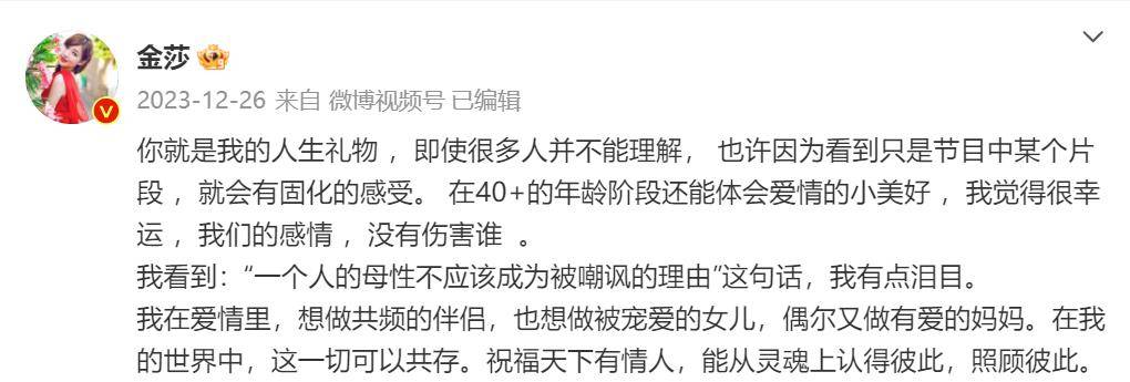 “你就是我的人生礼物 ,即使很多人并不能理解, 也许因为看到只是节目中某个片段 ,就会有固化的感受。 在40 的年龄阶段还能体会爱情的小美好 ,我觉得很幸运 ,我们的感情 ,没有伤害谁 。”