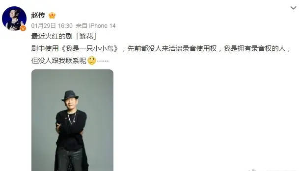 搜狐娱乐讯 近日,歌手赵传称《繁花》中使用了自己的《我是一只小小鸟》,但先前并未与他洽谈录音使用权。30日,《繁花》出品方泽东影业回应道:“我们昨天第一时间和环球音乐一同联系了赵传和版权所属团队,并做了相应的解释和沟通。并相约今天进一步展示我们合作记录,解除相关误会。”