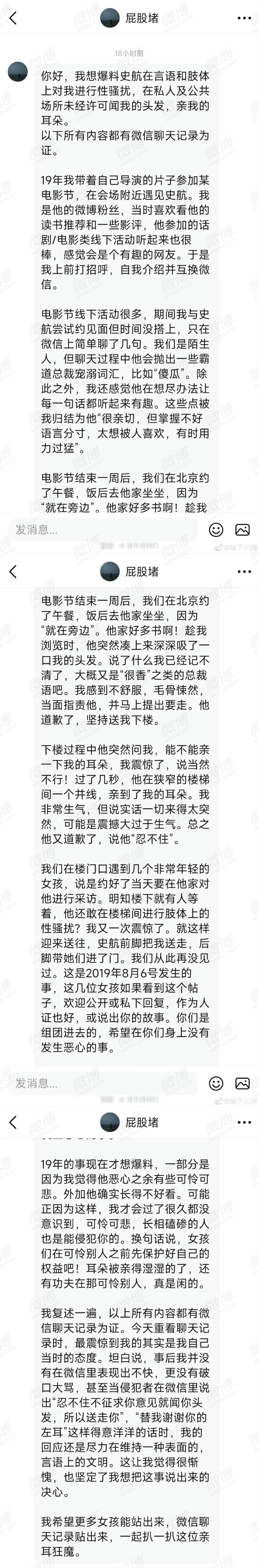 据悉,2023年4月28日,用户“青年编辑们”发布了一篇匿名投稿,一个女孩指控知名编剧史航曾对自己实施言语和肢体上的性骚扰。此后,又有多名受害者以匿名或实名的方式站出来,控诉史航用相似的方式对其进行性骚扰。