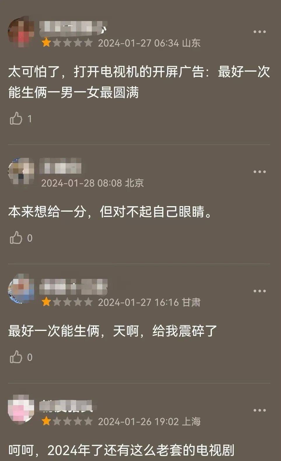 除了这个剧情很恶心外,许多观众也被这部剧的主题给雷到了,“最好一次生俩,一男一女最圆满”的宣传标语,让人不由地怀疑自己真的在21世纪吗?