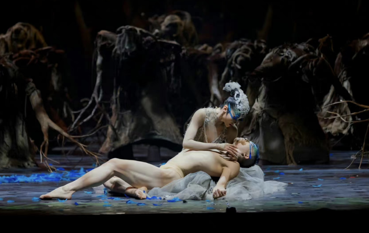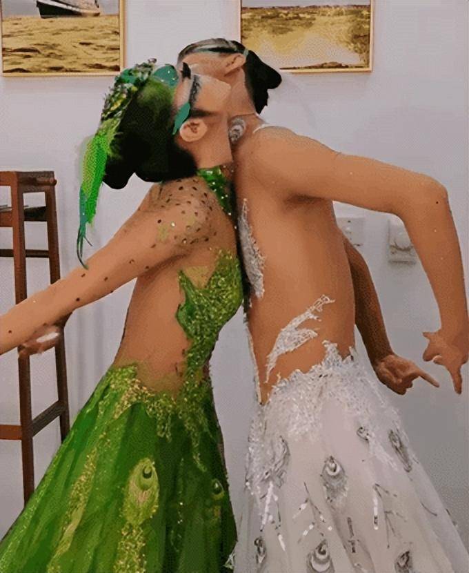因为他们穿着比较贴近皮肤颜色的紧身衣,做出孔雀互相交织的动作,本意是想模仿孔雀,所以男女之间身体互相交织。