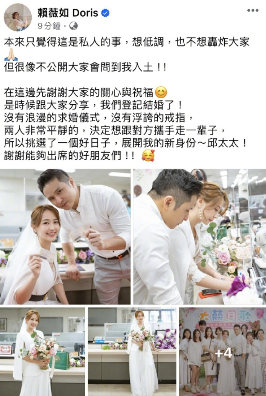 最近,「七朵花」成员之一的赖薇如,发文宣布已登记结婚: