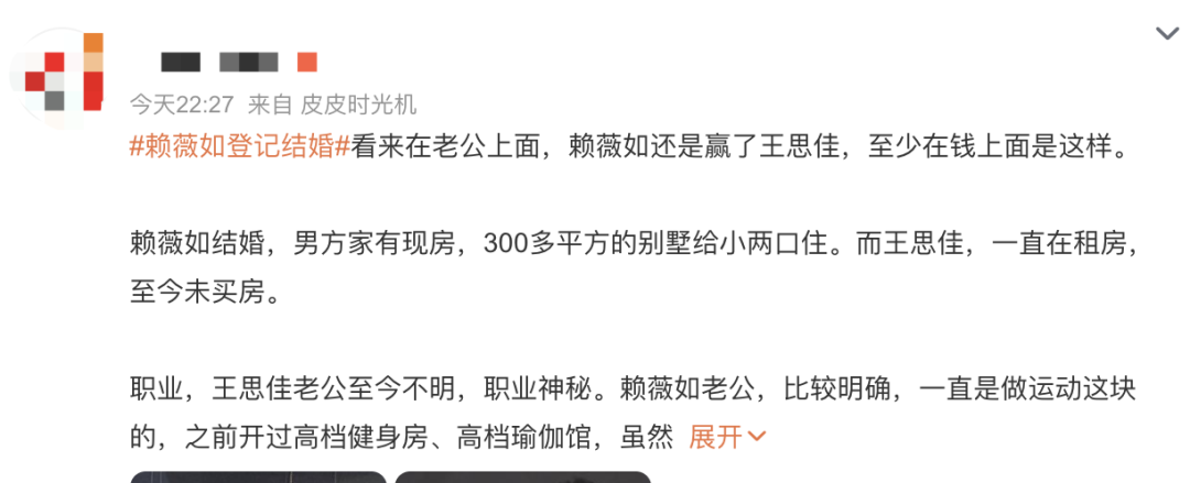 这才过去没多久,又有网友看热闹不嫌事大,赖薇如官宣婚讯,就有人评论拿她和王思佳做比较,