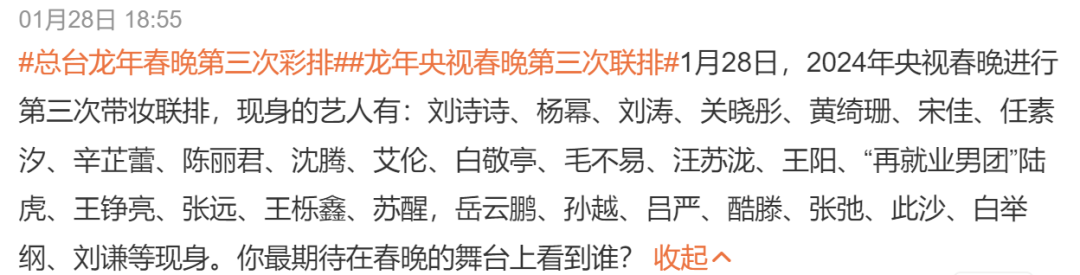 近日,2024年的春晚迎来了第三次联排,出现了更加多的明星阵容。