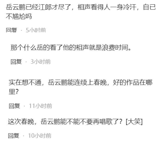 首先是喜剧人岳云鹏如今的口碑可以说是一落千丈,不少网友表示并不期待岳云鹏的相声表演,觉得岳云鹏已经江郎才尽了,想不懂他为什么能连续多年上春晚,更不喜欢看到他唱歌。