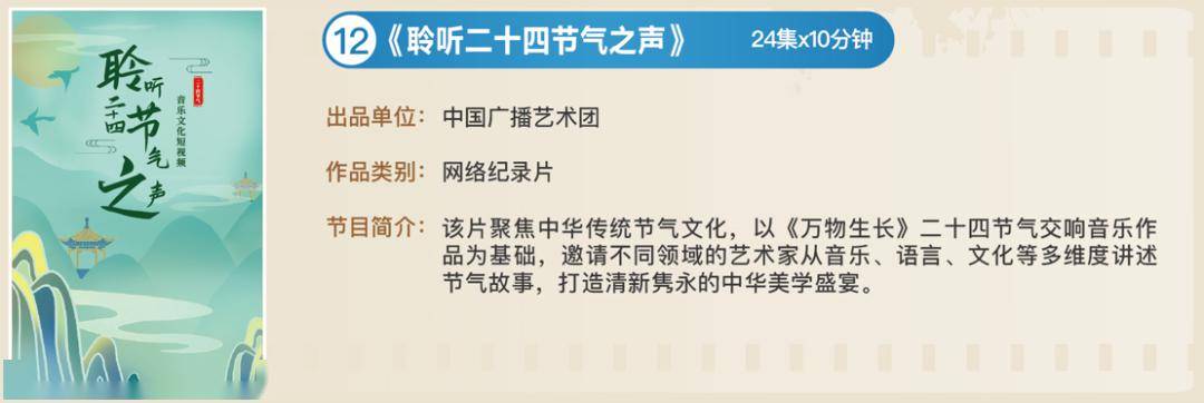 再如,网络纪录片中,《一脉》通过少年传承人对话建筑、礼乐、诗书、京剧等名家讲述人,呈现出丰富的历史文化内涵;还有《农谚中国》所诠释的传统农谚智慧,《聆听二十四节气之声》与《伽瑶带你走进敦煌石窟中的二十四节气》中的中华优秀传统节气文化,《妖怪传》中的妖怪故事,《惟有香如故》对香料的冲突和选择等,展现了中华优秀传统文化的不同侧面;而网络动画片《中国奇谭》以动画形式讲述了8个根植于中国传统文化的独立故事,呈现出中华文化跨越时空的魅力;《阿优讲故事:漫说中华文化密码》用儿童看得懂、喜欢看、有兴趣的动画作品,让传统文化不断走近大众,并“流淌”于日常生活。