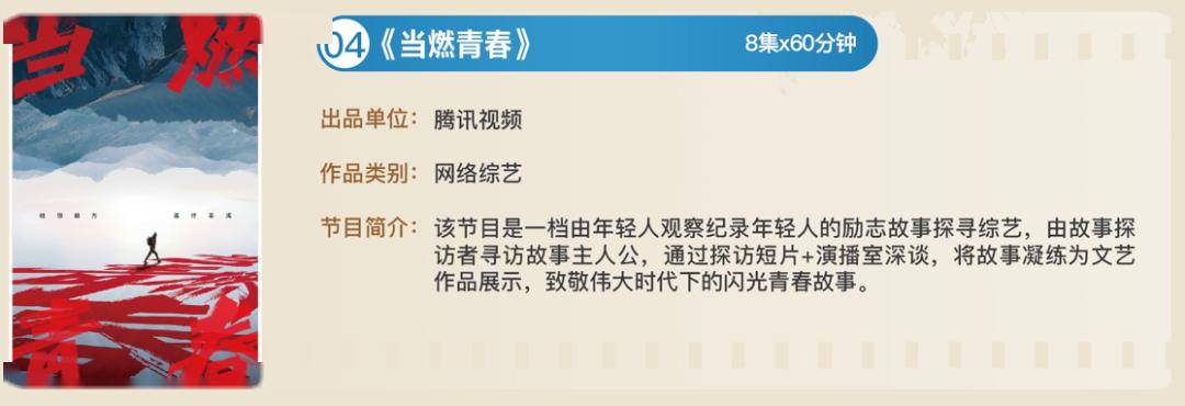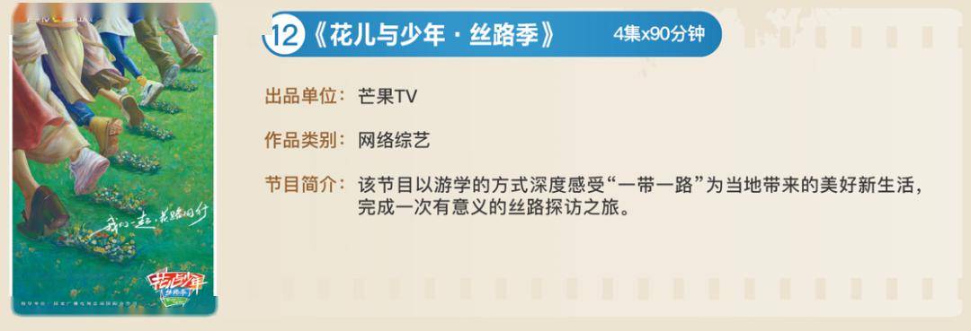 同样入选的网络综艺《花儿与少年·丝路季》在游学中深度感受“一带一路”带来的美好新生活,包括迪丽热巴展示的民族舞蹈等更是受到观众热捧;而《当燃青春》通过探访短片 演播室深谈,致敬闪光青春故事;《种地吧》通过真实农场运营,见证了少年们与麦子共同成长。