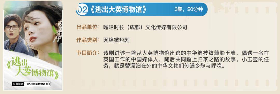 比如,网络微短剧《逃出大英博物馆》在全网得到热播,正是两名年青人的突发奇想之作,这一段中华缠枝纹薄胎玉壶踏上归家之路的故事,一方面替漂泊在外的中华文物们传递乡愁与呼唤,更是反映了当代青年浓浓的家国情怀;网络剧《正好遇见你》以苏州博物馆举办的全国文物展为背景,讲述了团队为展现中华文明之美的辛勤努力。