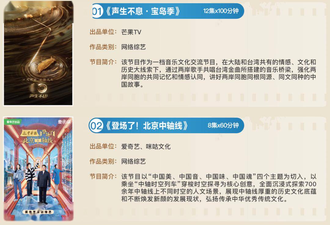 在入围的2023年精品网络综艺节目中,《声生不息·宝岛季》以音乐与两岸同胞的记忆,共同凝聚起中华文化与情感的认同;《登场了!北京中轴线》则以中轴线为介,呈现其厚重的历史文化内涵;《乘风2023》尽显女性力量之美、中华文化之美;《2022最美的夜billbil晚会》已经成为独有的辐射影漫游经典IP的视听盛典;《锵锵行天下》(第三季)集文化体验与脱口秀为一体,畅谈更多味道的江南;《我在岛屿读书》(第二季)带领观众共同品味书中人生;《邻家诗话》(第五季)把诗词与观众自身的情绪相结合,激活血脉中的诗词记忆;《丹青中国心》以笔墨为器,勾勒中国人精神天地;《乐队的夏天》(第三季)27支乐队为了梦想共同竞逐年度HOT5乐队。