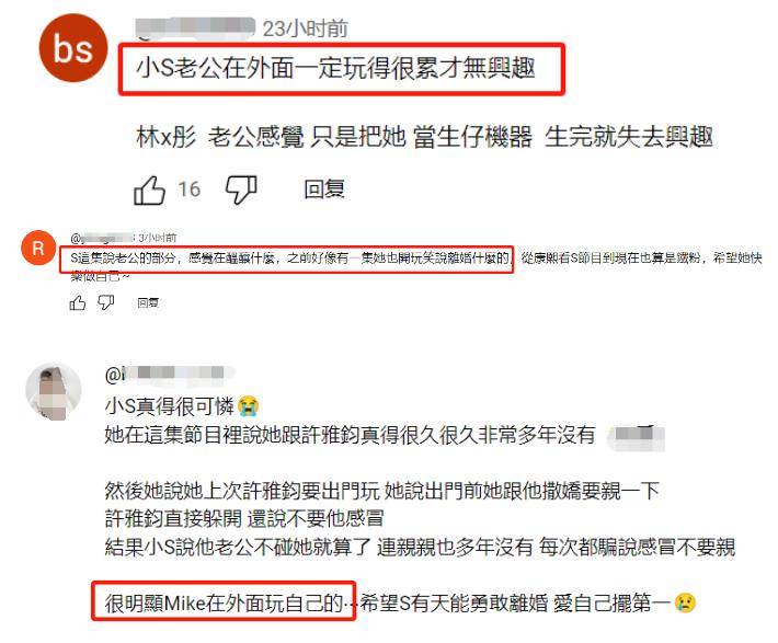 ——节目上线之后,评论区对小S的态度意外温和,觉得她很可怜,可能因为看节目的都是她的粉丝吧,但观众还是很清醒的,纷纷表示小S老公在外面没少玩,所以回家才没有兴趣,建议小S早日离婚,能把爱自己摆在第一位。