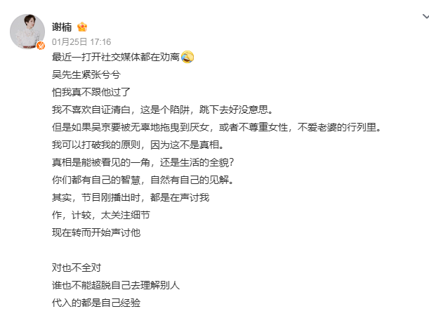 谢楠发长文称,网友都在劝她离婚,整得吴京非常紧张,生怕自己不和他过了,谢楠表示吴京厌女、不爱老婆的传闻都不是真的,当时节目才播出时,自己也受到了许多审判。