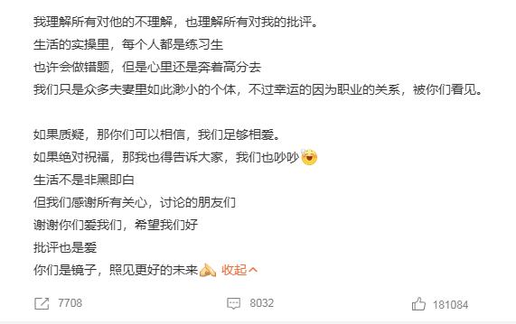 因此,吴京和谢楠的婚姻到底好不好,全看观众看到的是哪方面,因此没有理由因为几个不好的片段,而唱衰他们的婚姻,也不需要因为好的片段,把吴京捧上神坛。