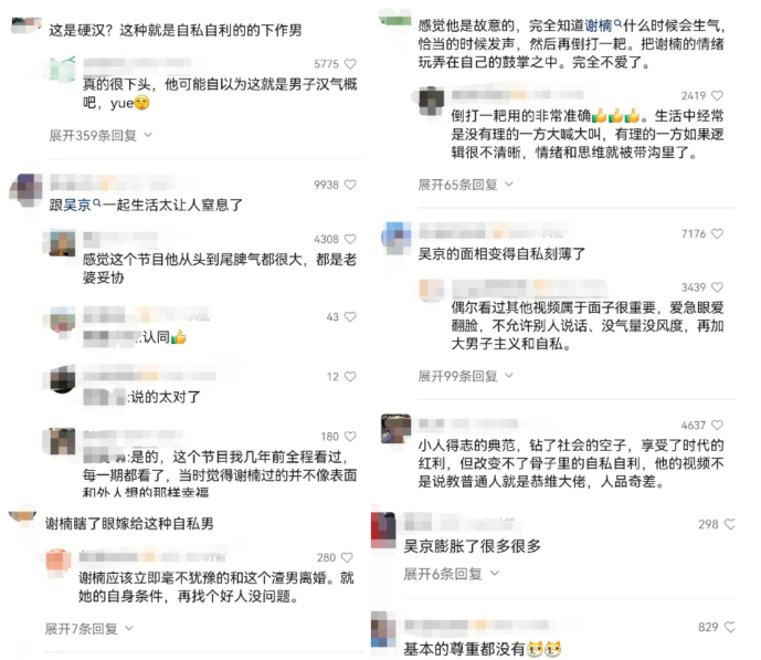 吴京和谢楠被截取的综艺片段,都表现出了吴京的脾气暴躁,比如吴京在煮好面只顾自己吃饭时,谢楠生气他不叫自己吃饭,但吴京又突然对谢楠说“你尝尝吗?”
