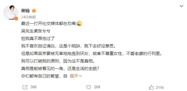 原标题:谢楠发长文回应吴京近期争议!否认吴京不尊重女性、不爱老婆