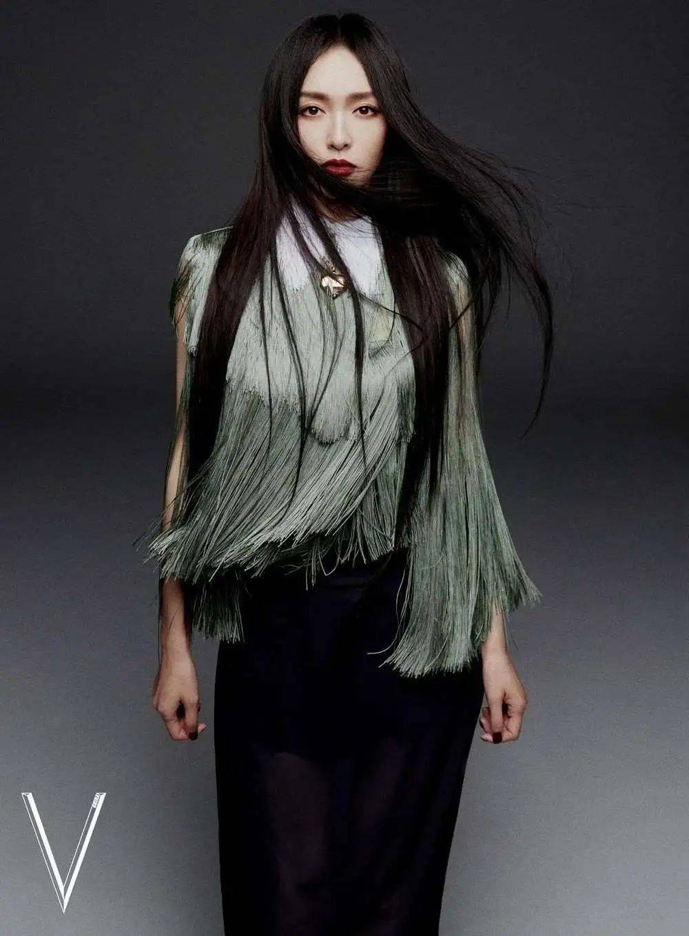 彩色图片中,唐嫣穿着一缕缕的绿色无袖上衣,搭配黑色长裙,她长发飘逸的样子,很是冷艳!