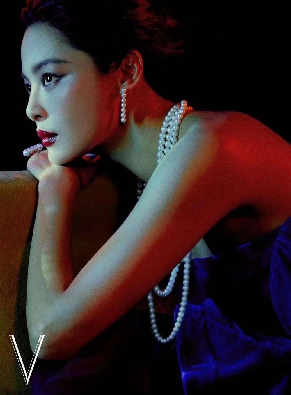 辛芷蕾穿着抹胸的蓝色长裙,她单手扶着沙发坐着,露出白皙的香肩和手臂,脖子上吊着大珍珠项链,这位美女若有所思的样子,还是很性感妩媚的!