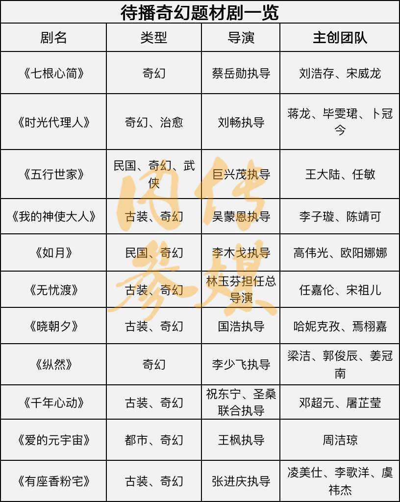 目前待播的奇幻题材剧达11部以上,包括《七根心简》《时光代理人》《五行世家》《我的神使大人》《如月》《无忧渡》《晓朝夕》《纵然》《千年心动》《爱的元宇宙》《有座香粉宅》。