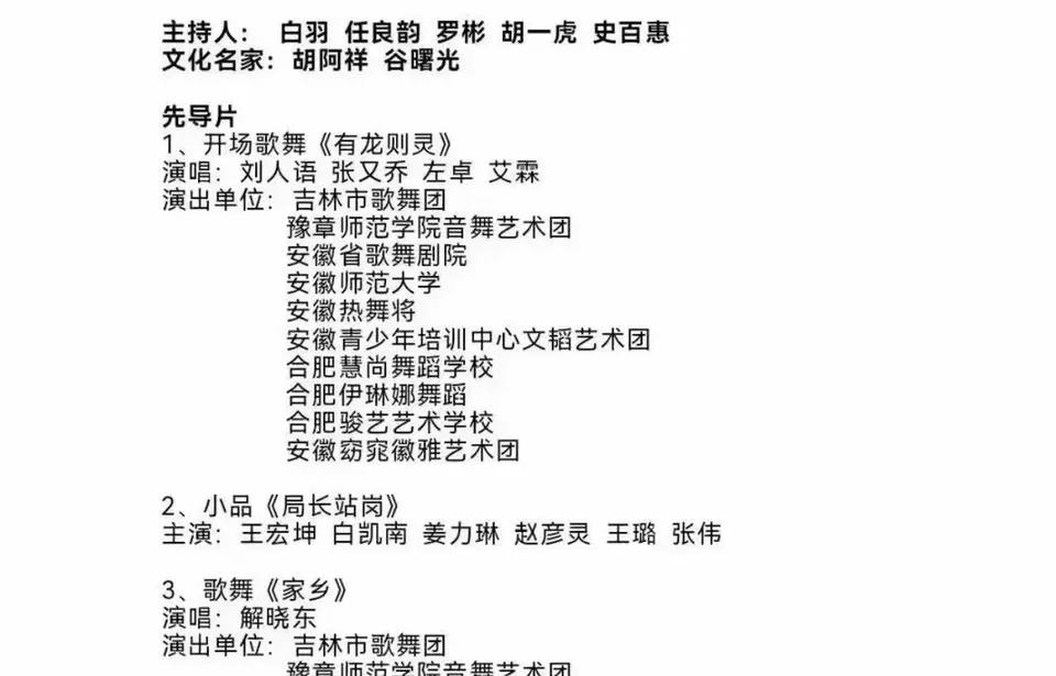 由于照片显示不全,角度问题,以及明星嘉宾大众知名度的问题,个人只认出来了汪苏泷、张杰、杨宏基、解小东、姜育恒、程响,网友评论演员阵容一年不如一年,说明安徽卫视确实没落了。引起很多网友热议的还有主持人阵容,包括白羽、任良韵、罗彬、胡一虎、史百惠5位组成。除了胡一虎是凤凰卫视的,另外4位都是安徽卫视自己的主持人。