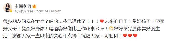 2023年,8月31日,时年47岁的李湘发微博称:“很多朋友问我在忙啥?哈哈…我已退休了!!!未来的日子!带好孩子!照顾好父母!锻炼好身体!好像比工作还事多呀!好好享受退休美好的生活!谢谢大家一直以来的关心和支持!祝福大家-切顺利!”