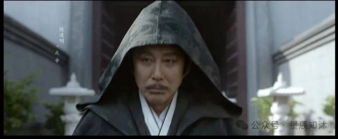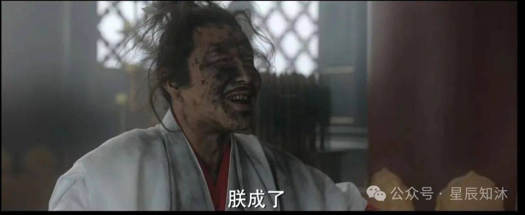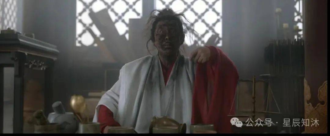 而陈道明饰演的庆帝,还是那个“衣衫褴褛”的老头子,自己在屋里捣鼓炸药。一不小心被炸成了黑煤球,就连牙齿都是黑乎乎的了。
