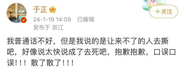 事后于正也通过社交平台表示自己开机的话是口误,说自己有口音,不是说“S吧”,而是“撕吧”,但广大网友并不买账,觉得有些太过分了。