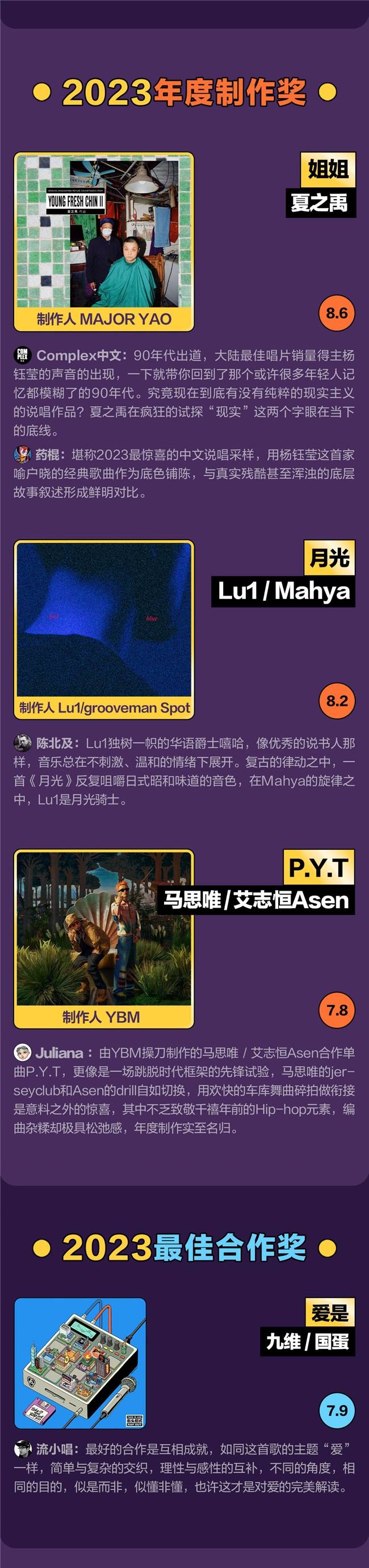 「年度最佳奖项」类别内同时评选了年度制作奖和最佳合作奖。夏之禹《姐姐》、Lu1,Mahya《月光》、马思唯,艾志恒Asen《P.Y.T》荣获2023年度制作奖,它们以各具特色的采样选择、别具一格的风格融合给听众带来中文说唱的行业标杆之作;而九维,国蛋《爱是》以两位天南地北的音乐人互相成就的风格荣获2023最佳合作奖。