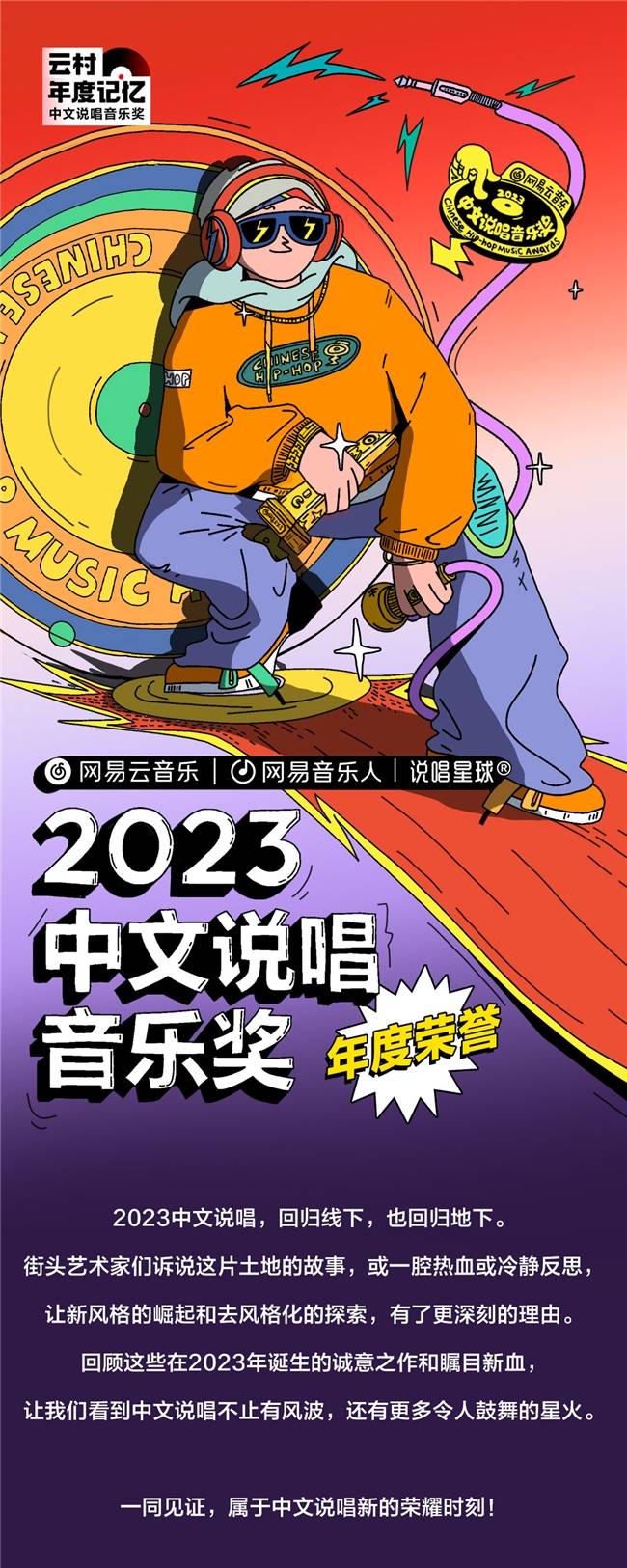2024年1月17日,经前期大众提名投票和专业评委会评审,网易云音乐发布了2023中文说唱音乐奖,嘉奖过去一年中文说唱的品质诚意之作。本次音乐奖以更加全面的视角回顾了2023年中文说唱风格和发展趋势,为所有喜爱说唱音乐的乐迷们呈现了中文说唱的魅力,共享过去一年中文说唱的闪耀瞬间。
