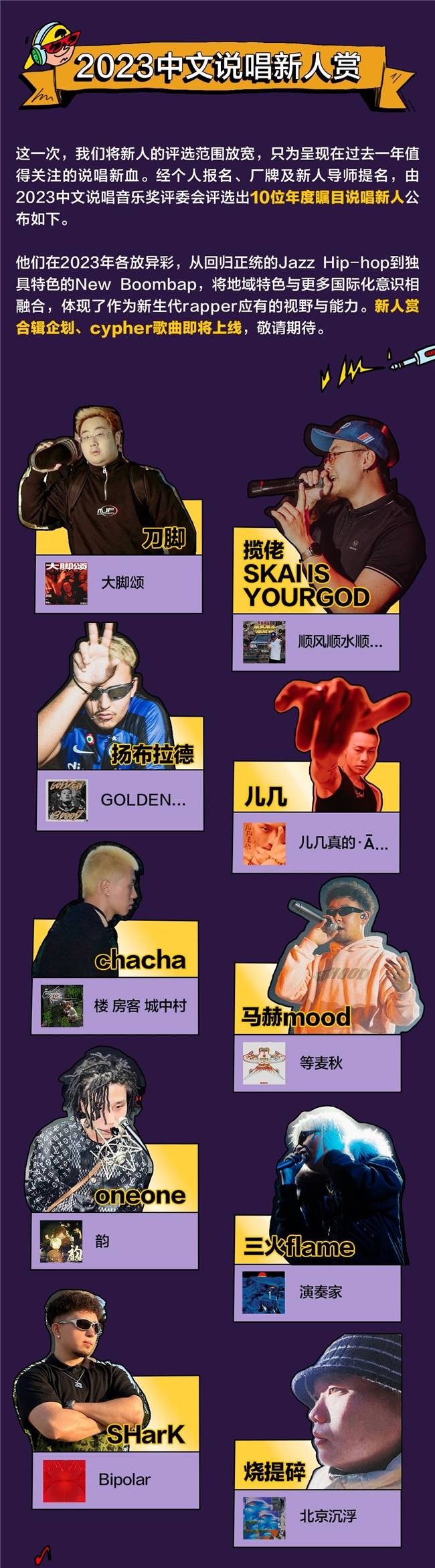 同时,经个人报名、厂牌和新人导师提名,本次奖项评委会评选出10位年度瞩目说唱新人:刀脚、揽佬、扬布拉德、儿几、chacha、马赫mood、oneone、三火flame、SHarK、烧提碎。他们的音乐各具特色,既有对传统Jazz Hiphop的延续,也不乏新兴地域元素融入的风格之作,各放异彩的作品展现了新生代rapper的音乐视野和能力。