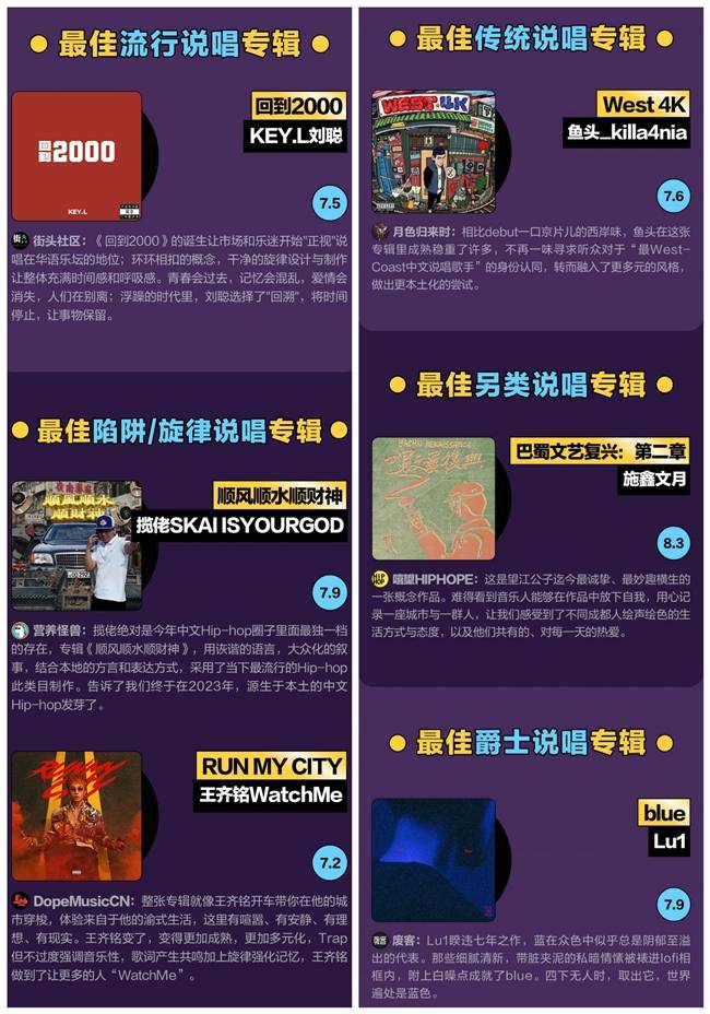 在多元说唱风格肆意生长的当下,网易云音乐也捕捉到这一趋势,以受听众认可的流行、陷阱/旋律、传统、另类、爵士的分类评选了6张最佳说唱专辑。KEY.L刘聪《回到2000》以流畅干净的旋律和制作获得最佳流行说唱专辑;揽佬《顺风顺水顺财神》和王齐铭《RUN MY CITY》独具地域特色,获得最佳陷阱/旋律说唱专辑;鱼头_killa4nia《West 4K》、施鑫文月《巴蜀文艺复兴:第二章》、Lu1《blue》各自融入了音乐人自身的独特风格,分别获最佳传统说唱专辑、最佳另类说唱专辑和最佳爵士说唱专辑。