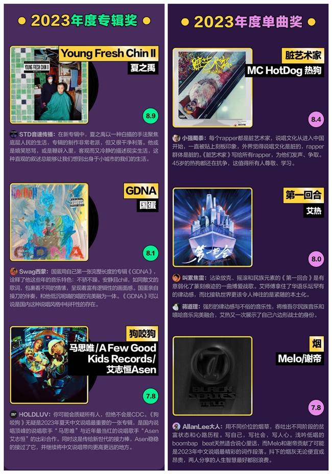 「年度最佳奖项」类别由奖项评委会根据编曲制作水平、单曲或专辑概念与整体性及商业性等参考维度综合决定。其中,夏之禹《Young Fresh Chin Ⅱ》、国蛋《GDNA》、马思唯,A Few Good Kids Records,艾志恒Asen《狗咬狗》获2023年度专辑奖;MC HotDog 热狗《脏艺术家》、艾热《第一回合》、Melo,谢帝《烟》获2023年度单曲奖。