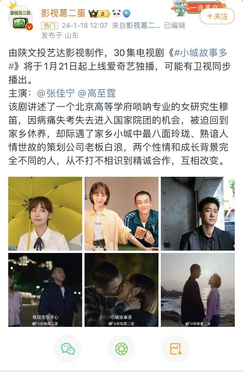 网友爆料张佳宁和高至霆主演的电视剧《小城故事多》将在1月21日播出,有可能会在芒果台上星播出。