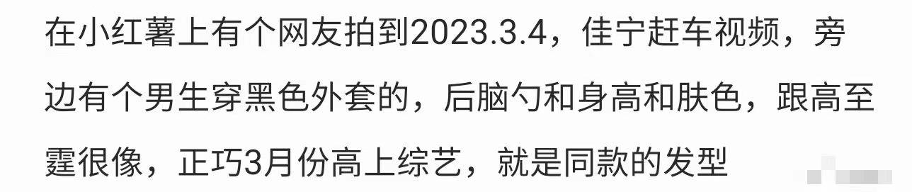有网友发现与张佳宁一同回住处的男友疑似是演员高至霆,高至霆在《致我们单纯的小美好》饰演吴柏松,是屈楚萧的中戏同学,去年三月两人一起在车站被偶遇,视频中的人,造型、身形,都和高至霆很相似。