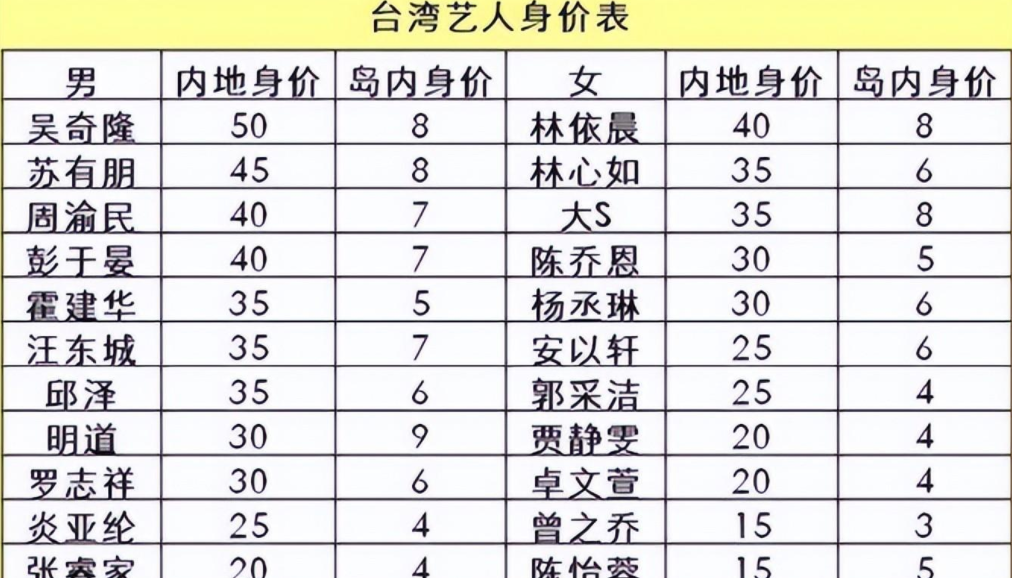 不仅是港星来内地之后收入翻倍,台湾省艺人来内地之后的收入大大提升。之前就有一张台湾省艺人来内地之后的身价对比表格传出,几乎都是翻了五六倍。