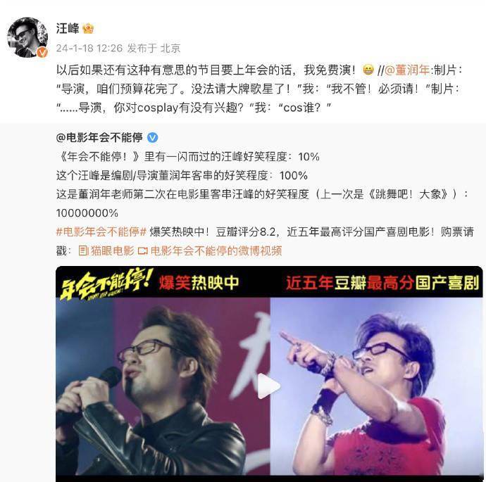汪峰随后也在社交媒体回复:“年会节目这么有意思这不得叫上我?这节目我免费演!”