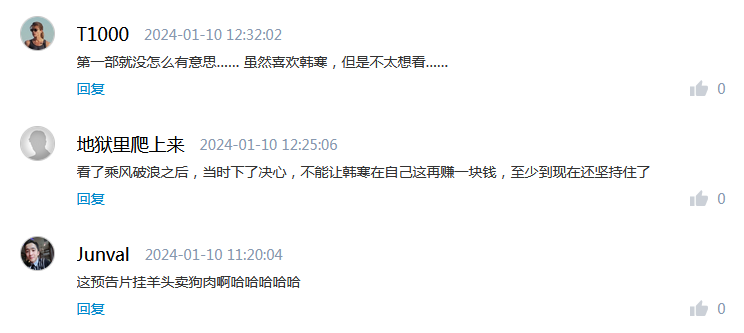 《飞驰人生2》定档大年初一后,很多网友都在大骂“第一部就没什么意思...虽然喜欢韩寒,但不太想看...”、还有人说“看完乘风破浪以后,当时就下了决心,不能让韩寒在自己这再赚一块钱,至少现在还坚持住了”,还有人吐槽:“这预告挂羊头卖狗肉,哈哈哈哈哈哈!”