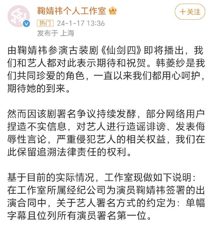《仙剑四》官宣之后,“鞠婧祎个人工作室”率先发布声明,我捡着最有用的,贴给大家: